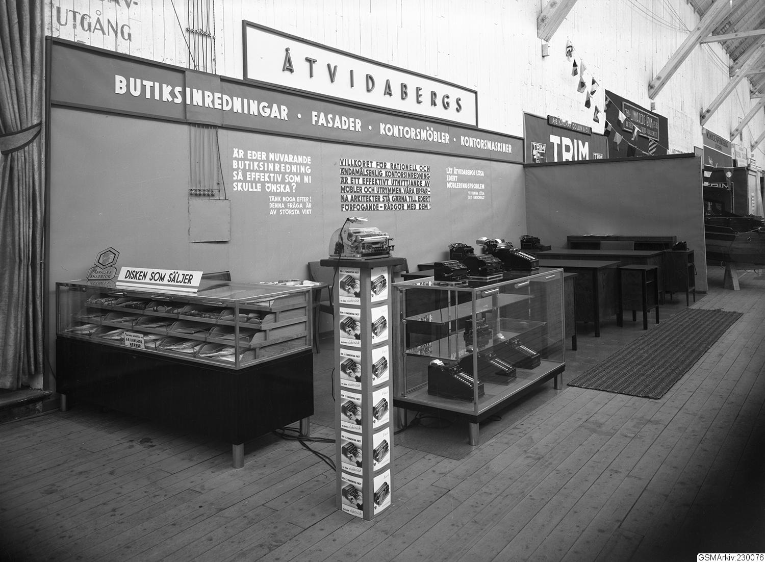 Svenska Mässan vid Korsvägen, Åtvidabergs monter med butiksinredning, kontorsmaskiner, kontorsmöbler och fasader.
