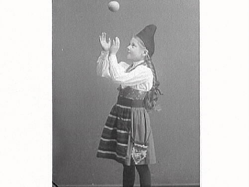 Flickporträtt. Flicka i folkdräkt leker med en boll.