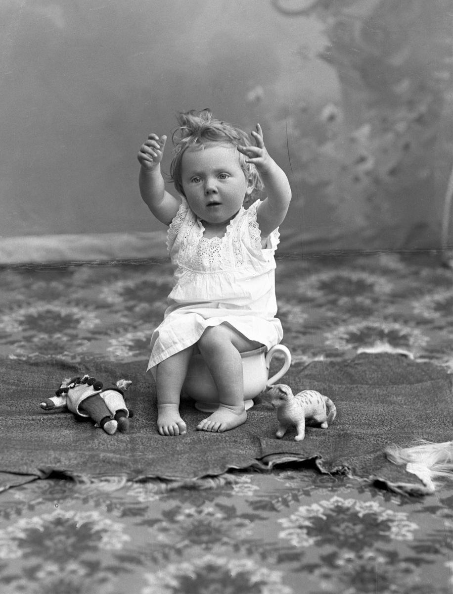 Atleljéporträtt av fotografens systerdotter, Anna-Stina Alling, som sitter på pottan och räcker upp händerna. På golvet ligger till vänster en (Pierrot)docka lllloch till höger en leksakskatt.