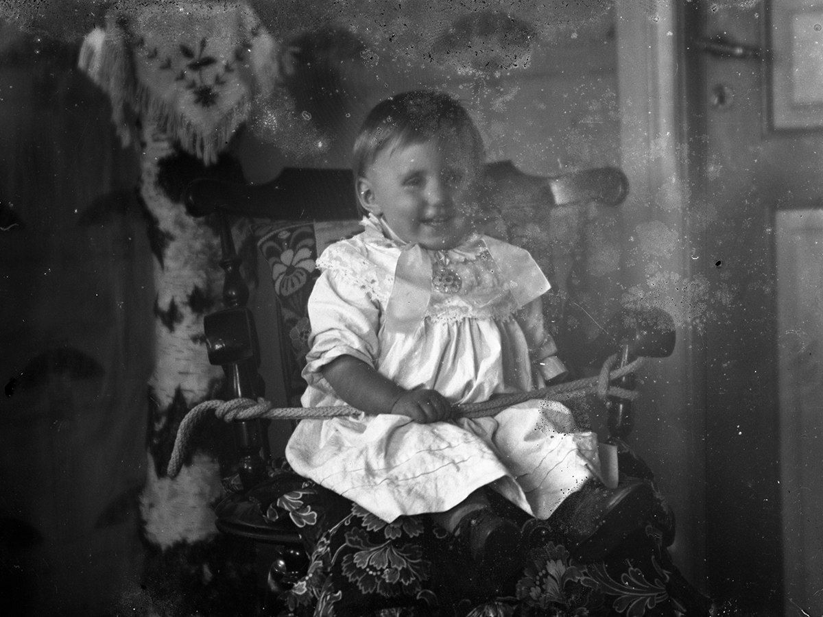 Barnporträtt. Ett barn fotograferat inomhus sittande i en stol. Framför barnet är ett rep spänt för att hindra att det faller ur.