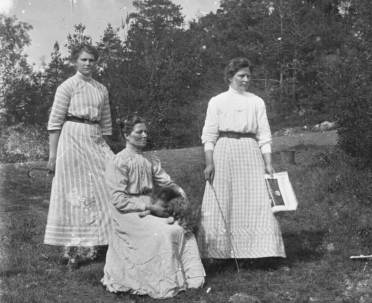 Gruppbild av tre kvinnor fotograferade utomhus.