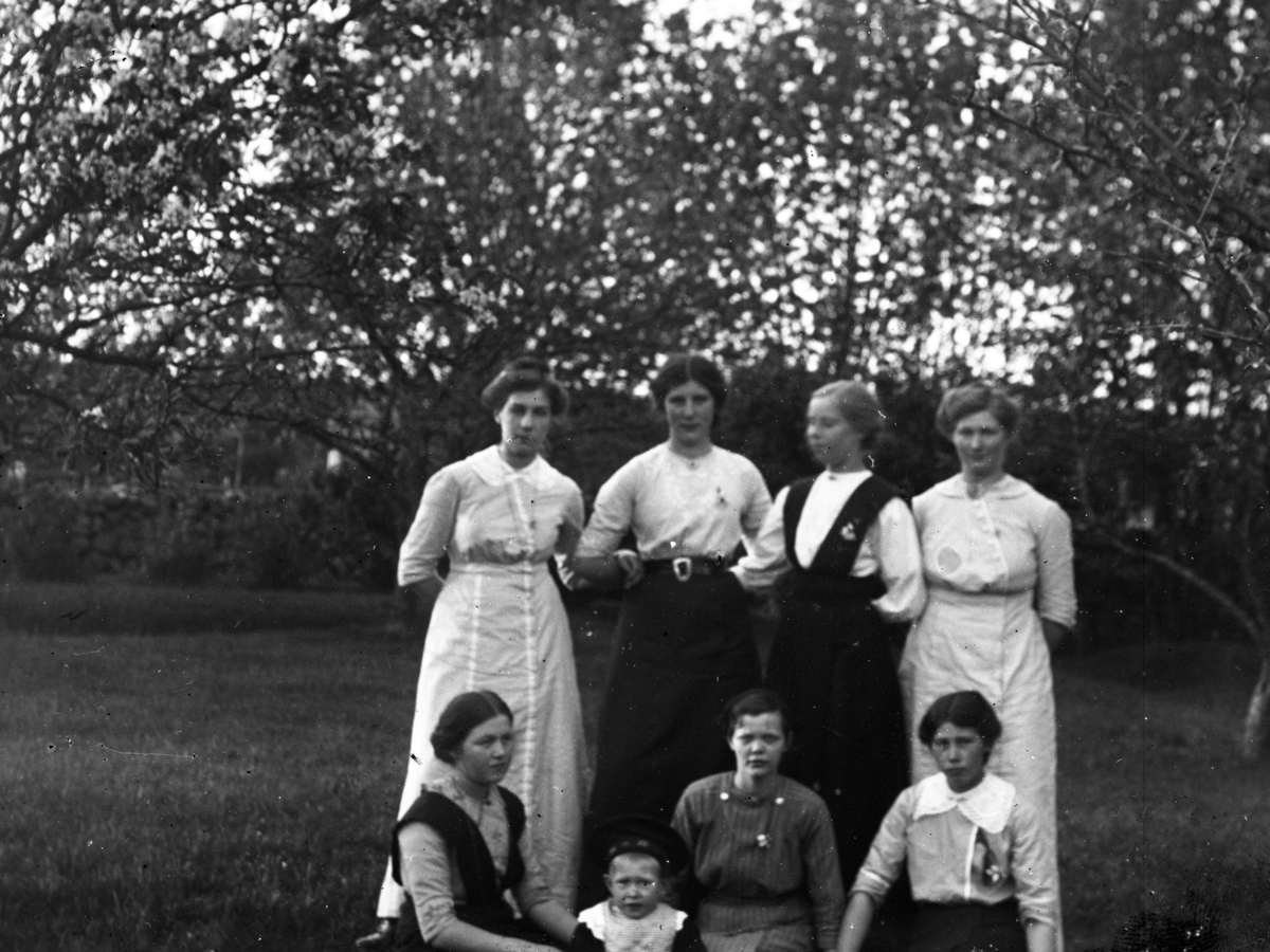Gruppbild med kvinnor och ett barn fotograferade utomhus.