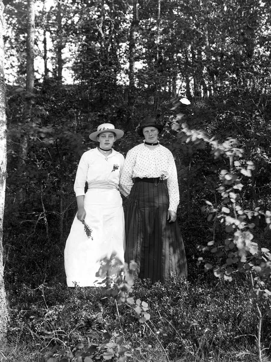 Systrarna Agnes (till höger) och Ellen Sikén fotograferade i en skogsbacke i Karl Gustav. Agnes har en ljus dräkt och ljus hatt. Ellen har mörk kjol och en mörk hatt.