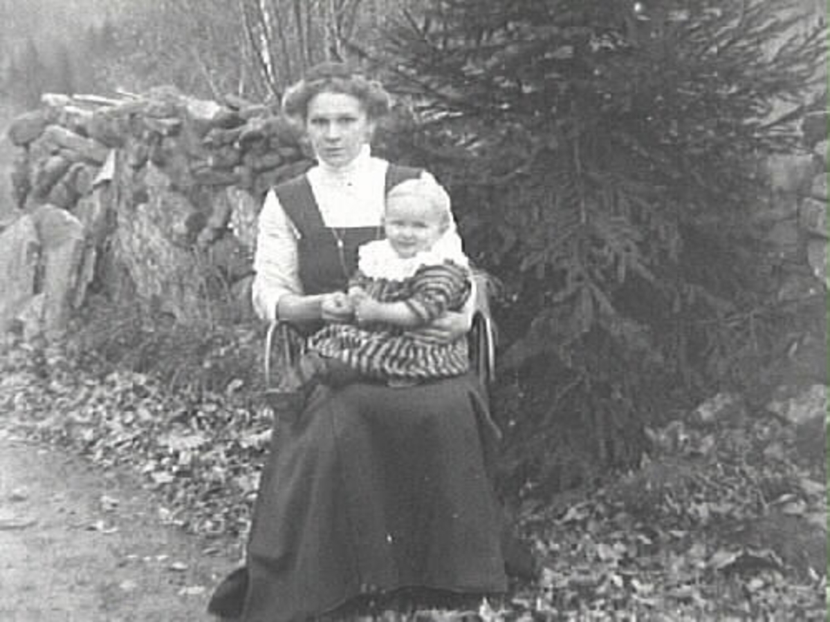 Familjebild?En kvinna och ett barn fotograferad utomhus sittande på en stol.