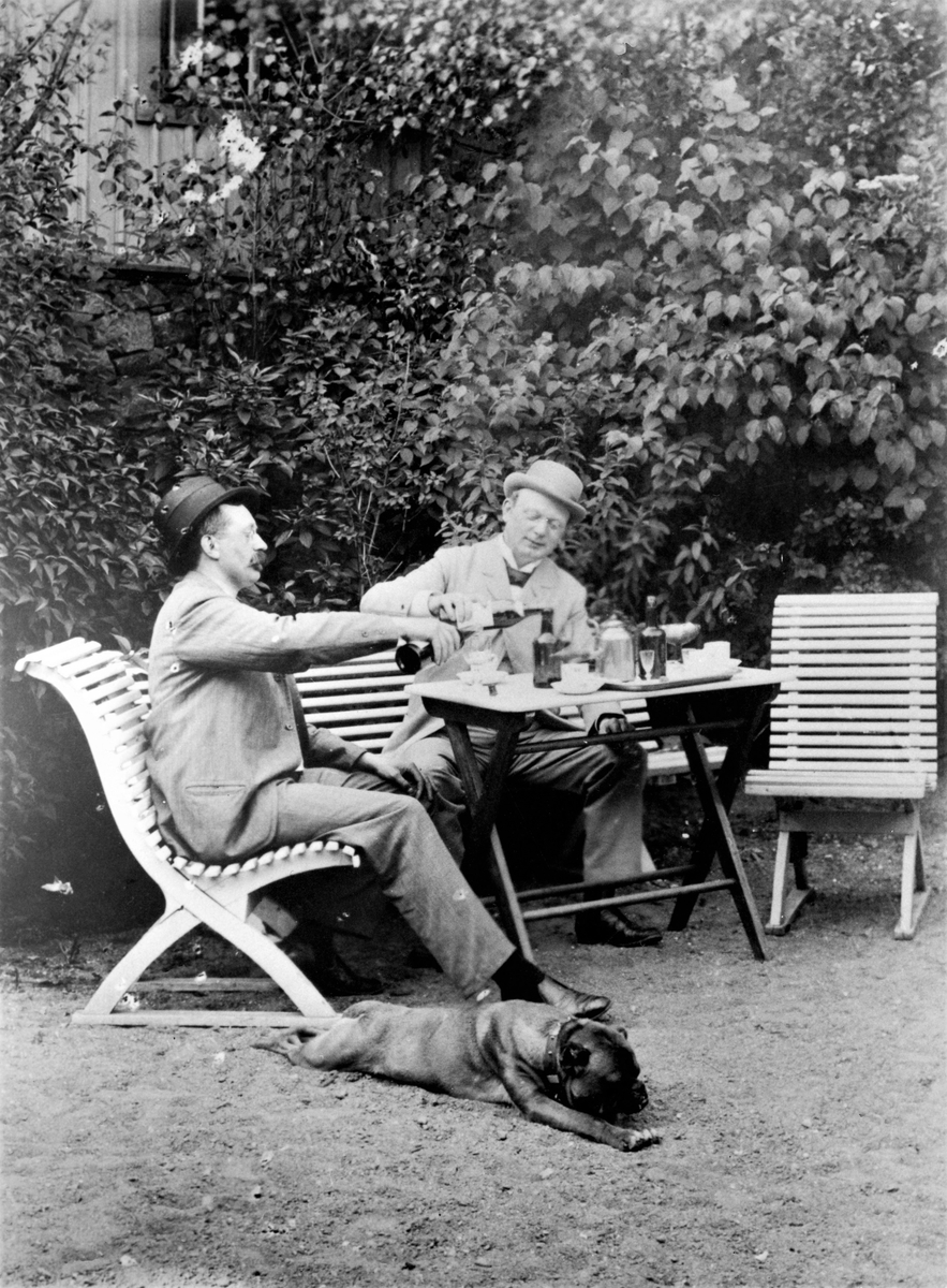 August Bondeson och vännen Hjalmar Carlsson sitter i en trädgårdsmöbel och slår i glasen ur buteljer. Båda bär kubb. På marken ligger en hund.