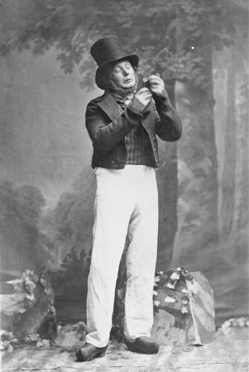 Anteckning på fotografiets baksida: "August Bondesson uppträder kostymerad och maskerad för 'Far rakar sig på söndagsmorgon', som han ofta läste vid sina berömda soaréer."