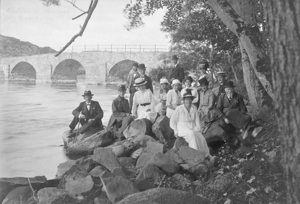 Ur grosshandlare Oscar Nordbloms fotoalbum. "Minne från Åsbro 12/8 1918". På en annan bild tagen vid samma utflykt, MR2_1563, benämns sällskapet som "Åsbroklubben". Här sitter de bland stenar nere vid Viskans kant med bron i Ås i bakgrunden. Bron med fyra spann (valv) anlades 1852, men vid dess södra fäste har en gästgivargård legat sedan åtminstone sedan 1700-talet. Landsvägen mellan Varberg och Borås gick här fram till 1955.