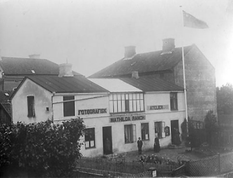 Mathilda Ranchs fotoateljé vid Prästgatan i Varberg. Tre personer står vid fasaden och i vinden vajar unionsflaggan, vilket påvisar att fotot togs före 1906. Ateljén byggdes 1890 om till detta utseende