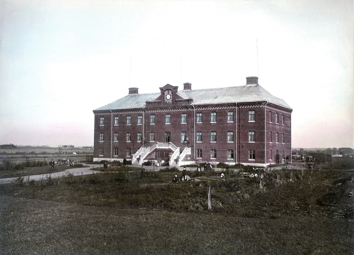 Delvis kolorerat fotografi. Fattiggården i Varberg med trädgård och omgivningar. En monumental fritrappa leder upp till entrén. I förgrunden syns odlingar i köksträdgården och några trädgårdsarbetare poserar för fotografiet. Man ser också äldre kvinnor som sitter på bänkar. På fälten bortom huset går kor på bete.