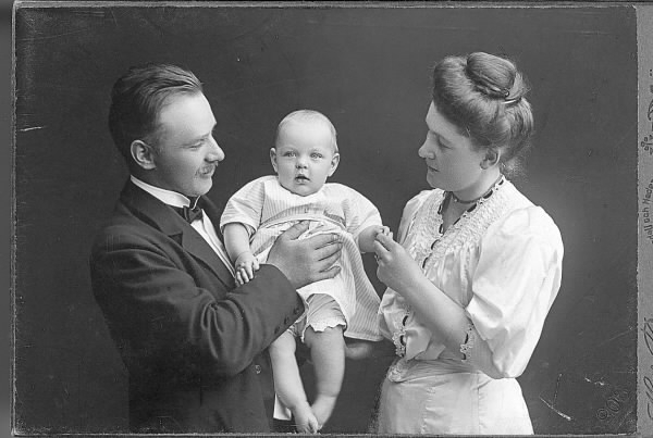 Familjebild av fotografens bror Wilhelm Ranch med frun Agnes f. Pehrson och sonen Uno född 1907. Agnes var tidigare Mathildas biträde i fotoateljén.