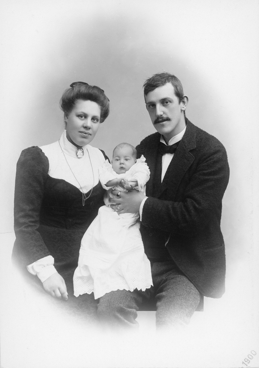 Ur grosshandlare Oskar Nordbloms fotoalbum. "God jul önskas Oscar af Gustaf Oscar Emil med pappa och mamma" Mannen är Oscars storebror konstnären Gustaf med maka Ebba f. Stoopendal. De utvandrade 1892 till Alaska men återvände några år till Varberg, där äldste sonen föddes år 1900. Familjen emigrerade snart för gott till USA där paret även fick barnen Daniel, Ebba och Brigitta och var bosatta i Brooklyn.