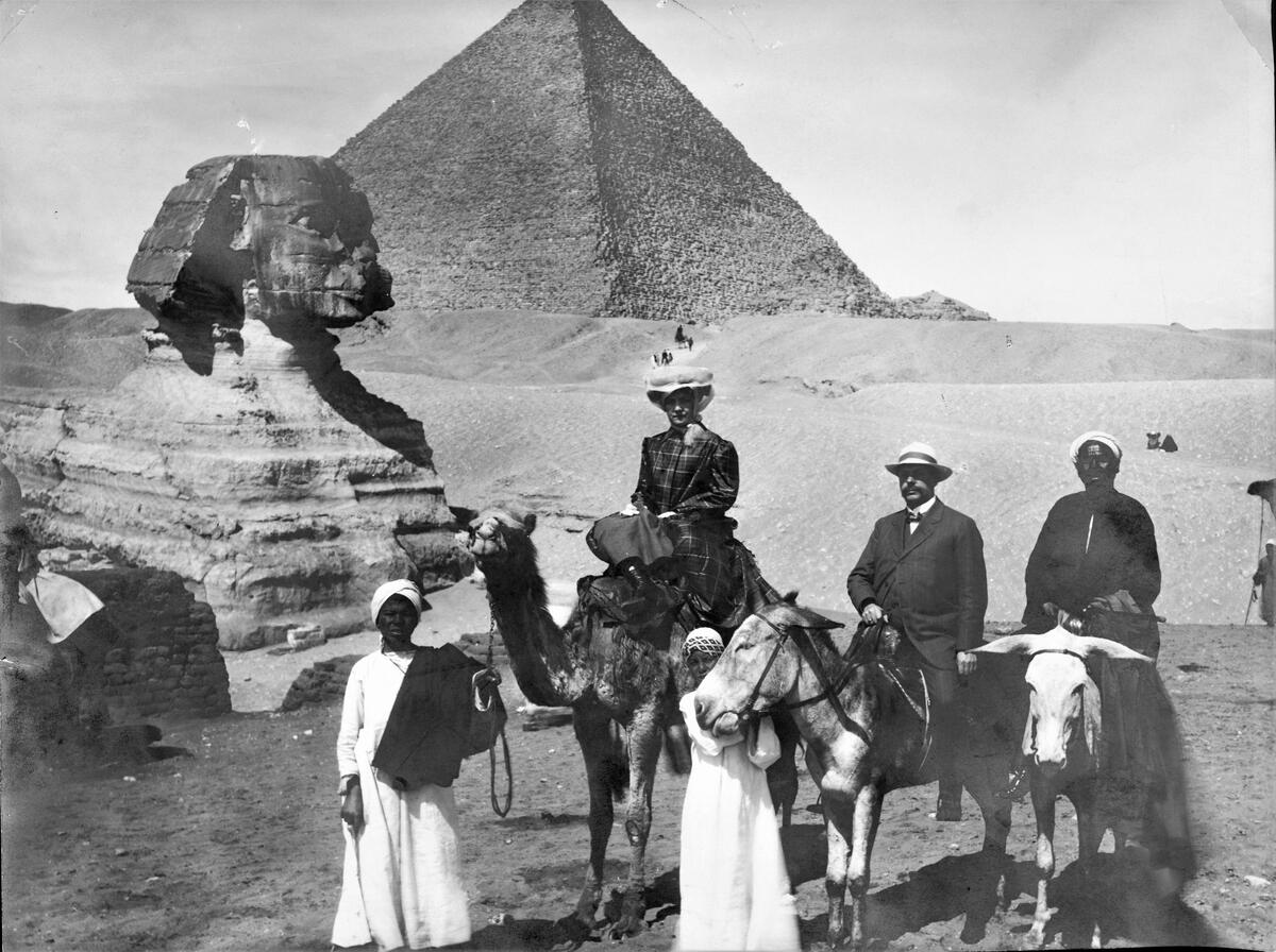 Ur grosshandlare Oscar Nordbloms fotosamling. "Vid Gizahpyramiderna och Sfinxen d. 1/8 1911". Enligt en annan notering på fotografiet kan det vara "makarna Hallberg" från Falkenberg på bilden, sannolikt Oscars syster Johanna som 1891 gifte sig med handlanden Harry Fredrik Hallberg. Kvinnan sitter på en dromedar och mannen på en åsna, liksom en av guiderna; övriga två håller turisternas riddjur.