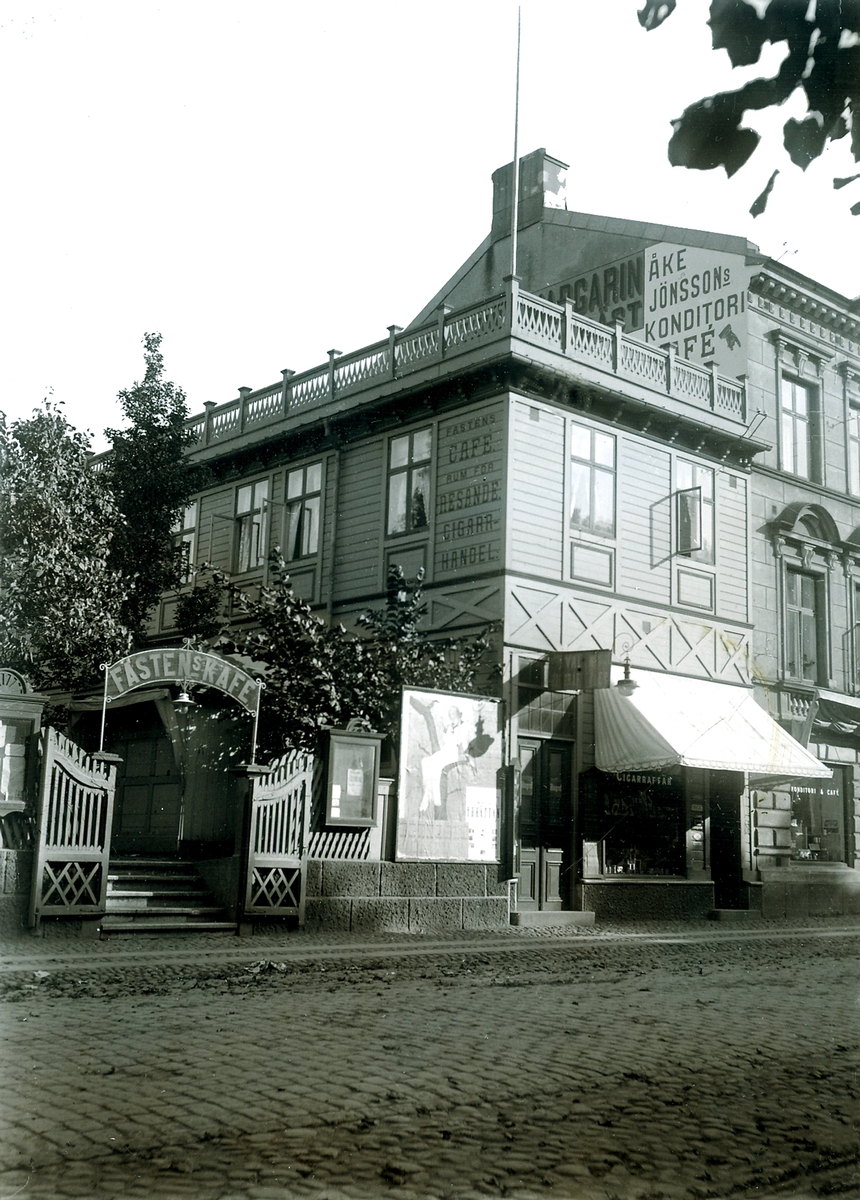 Ur byggmästare Johannes Nilssons fotoalbum från 1914. Fastens Café på Västra Vallgatan i kv Prosten med rum för resande och cigarraffär. Byggnaden uppfördes 1860 och i början på 1900-talet startades Fastens. Till höger ses skyltfönstret till Åke Jönssons konditori och café, med reklam på gaveln ovanför den stora takterrassen. En stor affisch med en kvinna som sitter uppe i ett träd annonserar en föreställning vid namn "Yrhättan".