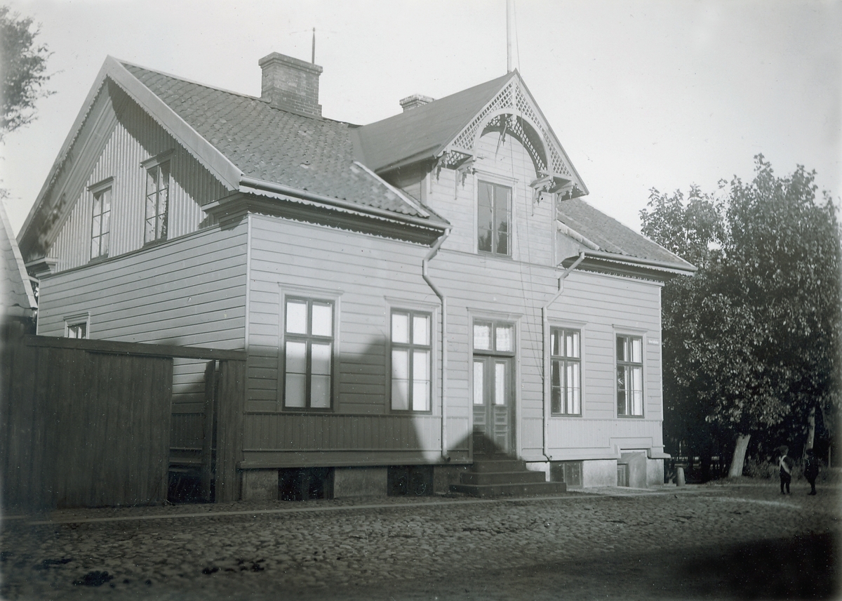 Ur byggmästare Johannes Nilssons fotoalbum från 1914. Bostadshus från 1800-talets mitt vid Östra Vallgatan i kv Garvaren. Till höger står två små barn på gatan.