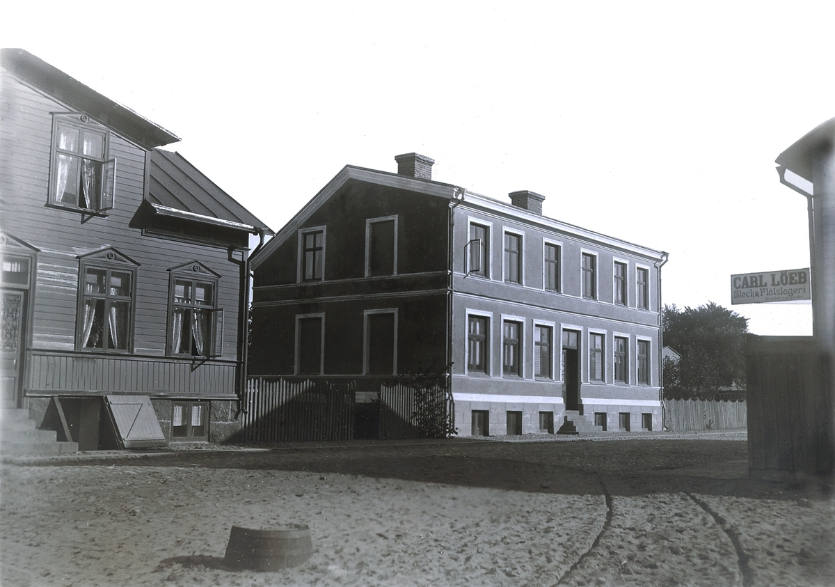 Ur byggmästare Johannes Nilssons fotoalbum från 1914. Gatumiljö med bostadshus i kv Falkenbäck, Borgmästaregatan 35-37. Huset till vänster har luckan till källaren öppen. På hörnan tilll höger ligger Carl Löebs Bleck & plåtslageri med verkstad in på gården.
