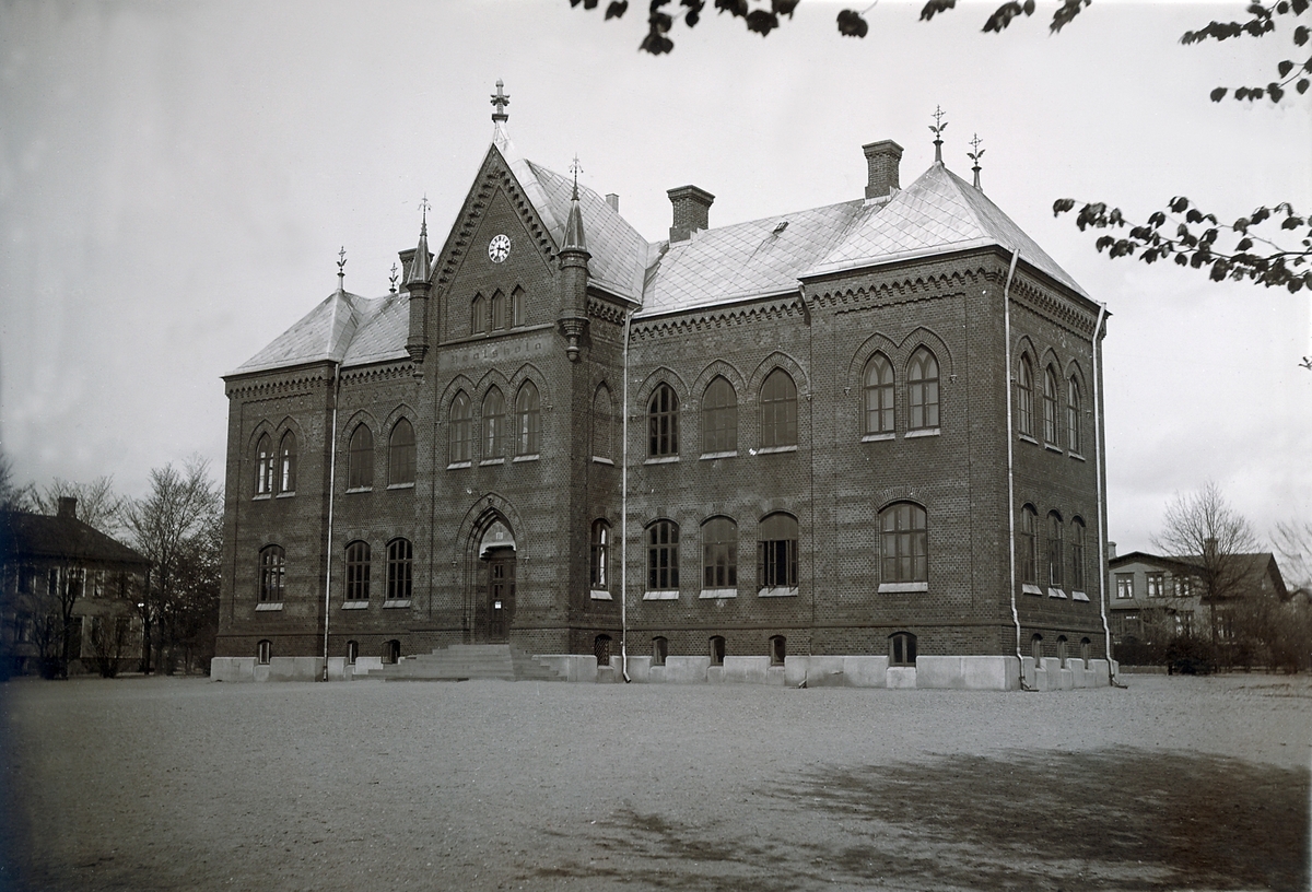 Ur byggmästare Johannes Nilssons fotoalbum från 1914. Elementarläroverket för gossar, invigdes den 10 december 1894. En omfattande om- och tillbyggnad gjordes 1919 och fram till 1953 drevs här realskola. Från 1954 fick byggnaden en ny funktion som stadshus då stadens förvaltning flyttade in.