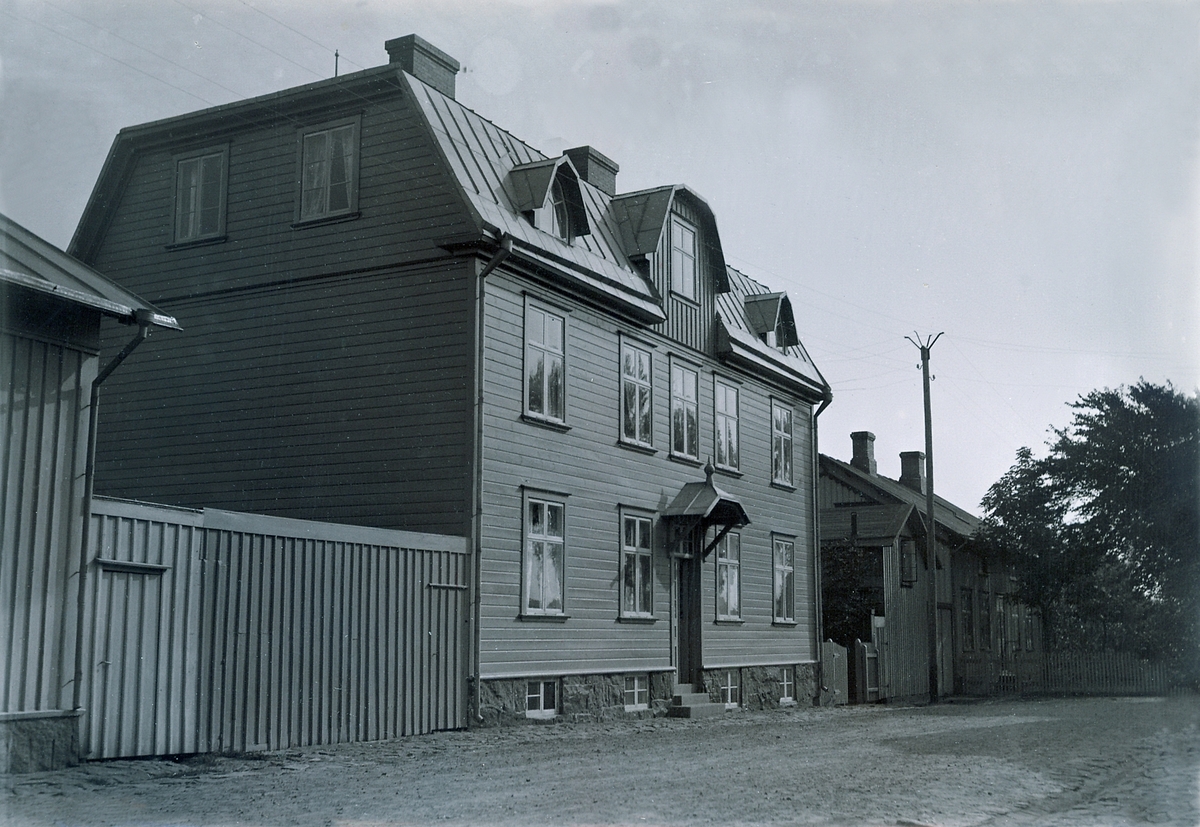 Ur byggmästare Johannes Nilssons fotoalbum från 1914. Bostadshus uppfört 1913 på Slottsgatan 15 i kv Lotsen. Tomterna hägnas mot gatan med plank och från elstolpen går ledningarna i olika riktningar. (Se liknande takutformning av byggmästaren på Slottsgatan 12 bildnr VMA11716 D34)