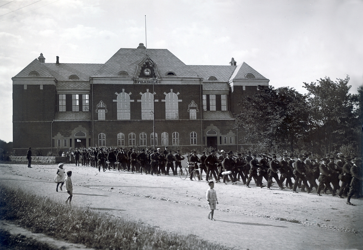 Ur byggmästare Johannes Nilssons fotoalbum från 1914. Rosenfredsskolan uppfördes under Nilssons ledning 1910-1912, efter ritningar av arkitekt Lars Kellman som även ritat Varbergs Teater. Ur skolan marscherar män från Landstormen med gevär på axlarna, med anledning av första världskriget. . Troligen har de just varit på inskrivning och är på väg mot Varbergs fästning. Landstormen hade inga uniformer, de bar sina privata kläder, men skulle bära fälttecken vilket enligt 1914 års infanteriinstruktion utgjordes det av ett landstormsmärke som skulle bäras väl fästat, och på avstånd synligt, samt landstormsarmbindel. Vid första världskrigets utbrott var de beväpnade med Remingtongevär.