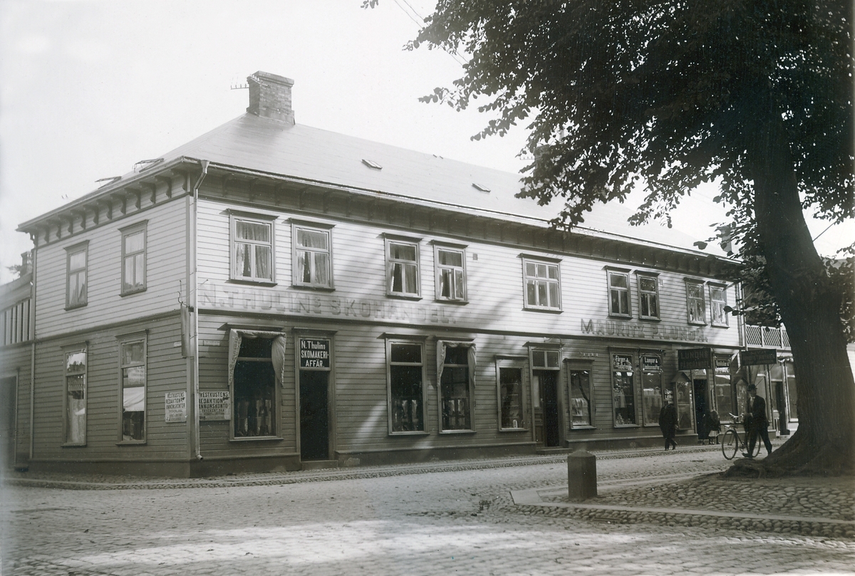 Ur byggmästare Johannes Nilssons fotoalbum från 1914. Byggnaden i korsningen Drottninggatan-Kyrkogatan, kv Apotekaren. Till vänster ligger N. Thulins skohandel och skomakeriaffär och till höger ligger Mauritz P. Lundhs färghandel. På fasaden sitter också reklamskyltar för tidningen Vestkustens redaktion och annonskontor med tryckerilokal, som ligger längre åt höger på Drottninggatan.
