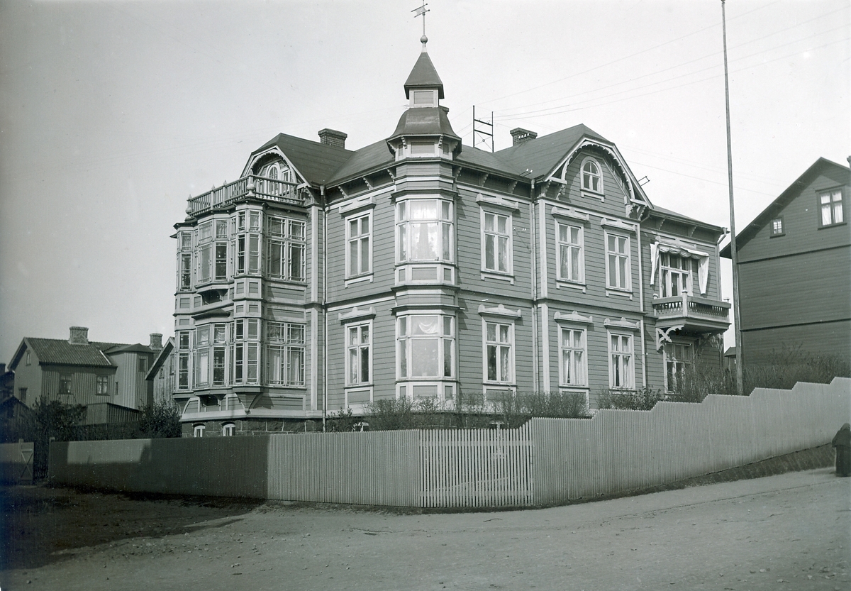 Ur byggmästare Johannes Nilssons fotoalbum från 1914. Rådman Mellins fastighet i korsningen Engelbrektsgatan-Sveagatan i kv Hunden. Byggnaden uppfördes 1905 och har ett mycket kraftigt burspråksparti i två våningar, krönt av en balkong, och hörnet kröns av en klockhuv med spira och flöjel. (Jämför med Bolanderska villan bildnr VMA11716 D67)