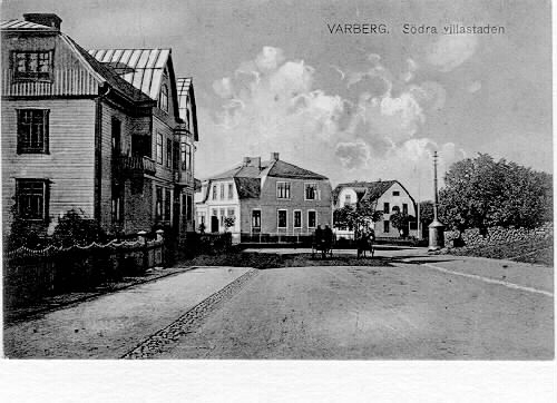 Vykort, "Varberg. Södra Villastaden". Här övergår Södra vägen i Kungsgatan. Bilden tagen mot nordväst. Till vänster byggnaden på Bomlyckan 2 och rakt fram Willners villa (f d Restaurang Gillet) på Bomlyckan 3 uppförd 1912 och till höger Villa Wäring byggd 1913 i kvarteret Kronofogden. De båda senare ritades av Gottfrid Ljunggren och mellan husen går Lasarettsgatan. (Se GB1_659 för Gustaf Björkströms original.)