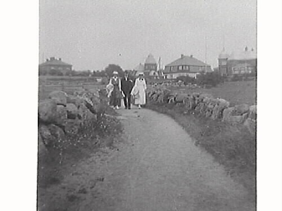 Två kvinnor och en man promenerar på en byväg kantad av stengärdsgårdar. I bakgrunden syns några av de flotta villorna i Södra villastaden i Varberg utmed Västra Vallgatan. Fastigheten till höger är Hejllska villan på Bomlyckan 1 (senare nr 10), uppförd 1904 åt stadsfiskal Nils Olof Samuelsson. Till vänster ligger fastigheterna Kronofogden 6, Kindvallska villan, och 7.