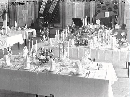 Utställning. Hemkulturutställningen i societetshuset (restaurangen) den 15-20/9 1931. Förslag på dukningar vid olika högtider. Framifrån räknat: 1: Silverbröllop, 2: Bröllop, 3: Guldbröllop. I bakgrunden Barres monter. Arrangör: Ernst Dyring. Glas och porslin från Linda Hansons.