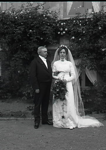 Bröllopsbild, brudparet stående i helfigur på gräsmatta intill ett rosenbuskage vid en husfasad. Bruden bär hellång slöja och håller buketten framför sig. Beställare: Kronofogde Emil Willner, men han gifte sig 1898 i Kristianstad så antingen har Willner beställt åt någon annan eller så har Björkström utfört reprofotografering av Willners egna foton. Villa Willner stod klar i kv Bomlyckan året därpå, 1912. (Se även bildnr GB2_764)
