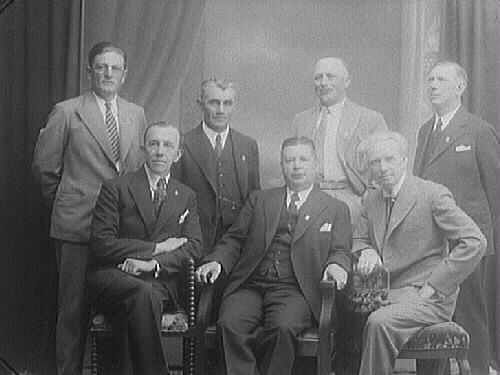 Föreningsgrupp. Hantverksföreningens styrelse. Stående fr v : rörläggningsentreprenör Oscar Dahlberg, plåtslagaremästare Carl Löeb, lokmästare Anton Larsson och urmakare Knut Lundgren. Sittande fr h bryggmästare Ivar Camitz, guldsmed John Victorin och elektriker Einar Barre.