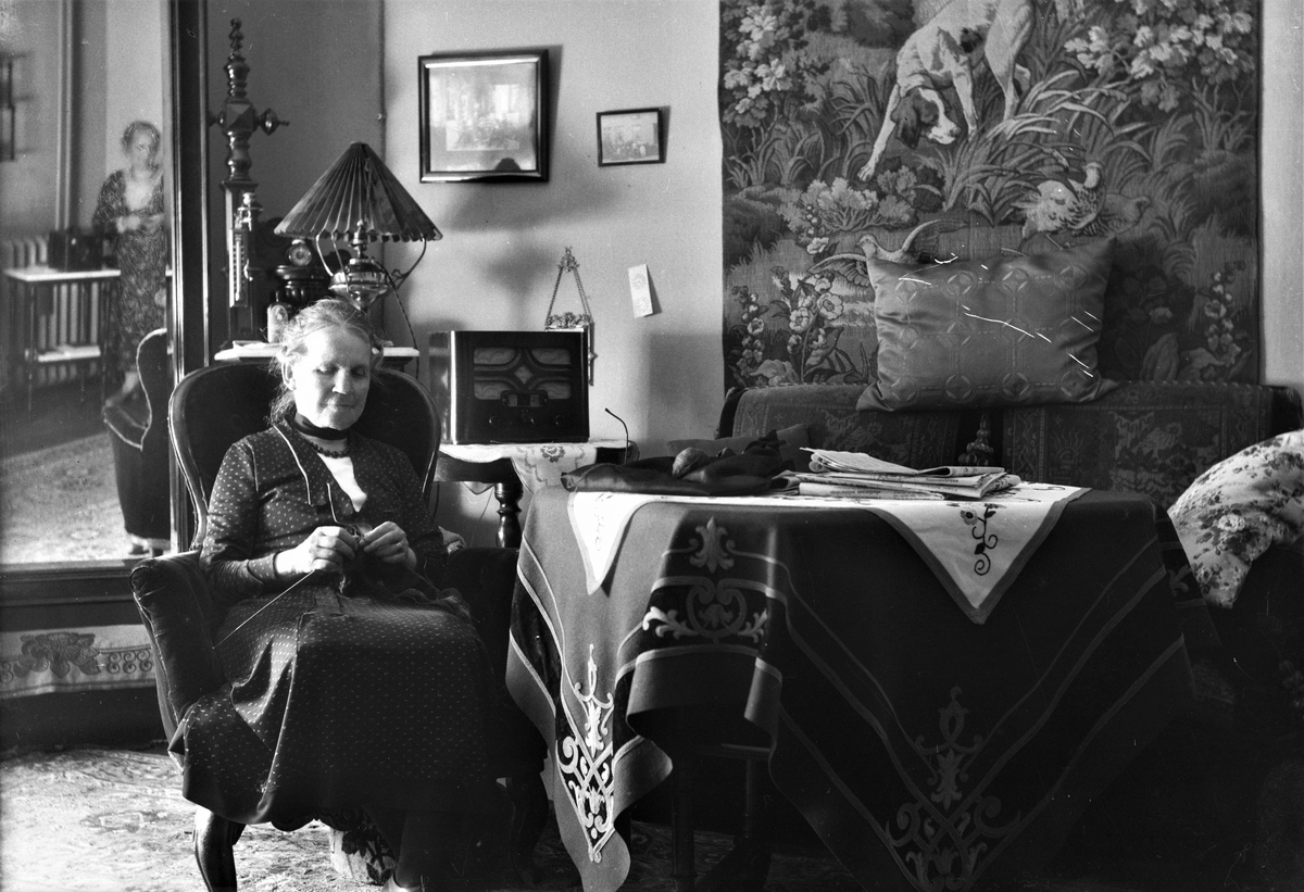 Interiör av Hejllska huset/villan med fru Håkansson i sitt hem (Varberg, kv Bomlyckan 10, Västra Vallgatan 61). Hon sitter och stickar i en fåtölj. Bakom henne står en radio på ett bord och på väggen hänger en stor gobeläng. I en stor spegel i bakgrunden syns fotografen och kameran.