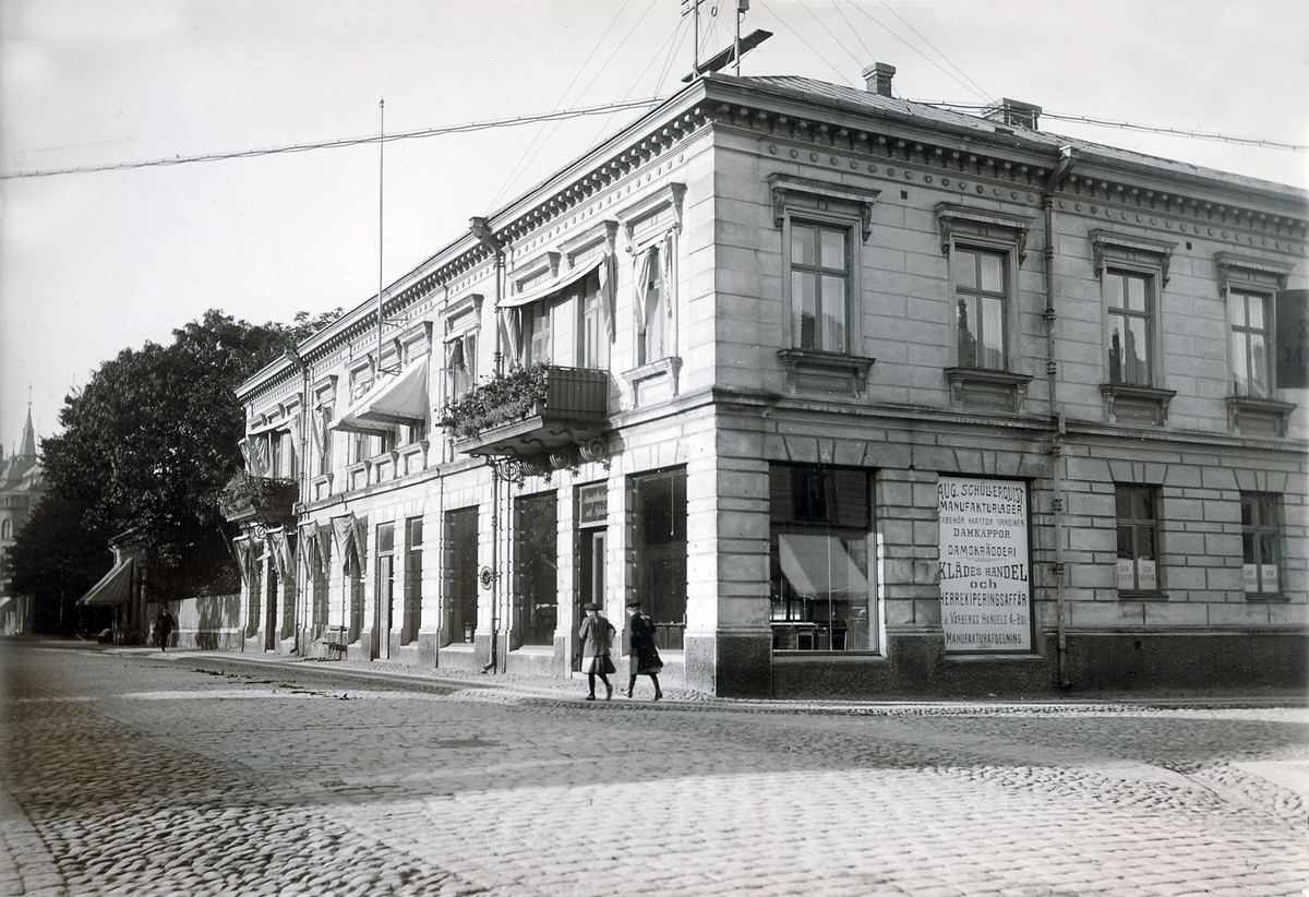 Ett skyltfönster vid Borgmästaregatan täcks av en skylt med reklam för Aug. Schüllerquists Manufakturlager med klädeshandel, damskrädderi, damkappor, herrekiperingsaffär, sybehör, mattor och gardiner.
