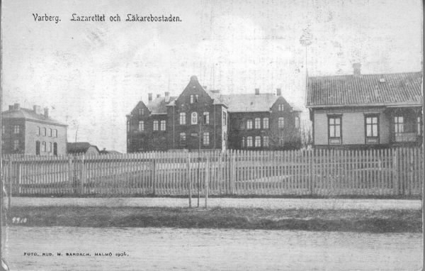 Vykortstext: "Varberg. Lazarettet och Läkarebostaden." Bilden visar lasarettet från 1901 i mitten med ekonomibyggnaden uppförd 1904 till vänster och läkarbostaden från 1883 till höger. Utmed Prästgatan hägnas tomten av ett trästaket och står nyplanterade träd.
