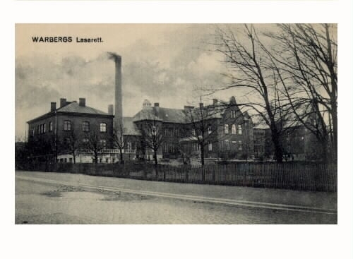 Vykort, "Warbergs lasarett" efter tillbyggnaden 1921. Axel Kumlien gjorde ritningarna till både lasarettet från 1901 och ekonomibyggnaden till vänster, uppförd 1904. Den höga skorstenen tillkom senare. I förgrunden går Västra Vallgatan.