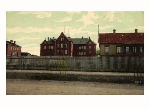 Kolorerat vykort av Varberg gamla lasarett från 1901, sett från Prästgatan. Till vänster ses ekonomibyggnaden från 1904 och till höger läkarbostaden uppförd 1883.