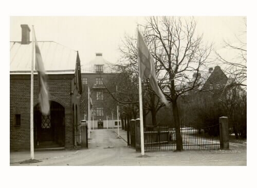 Vykort av grindstugan vid Varbergs gamla lasarettet, som invigdes 1901. Grindstugan med bostad åt portvakten uppfördes några år senare och förlades vid Prästgatan. Flaggstänger markerar entrén och vägen fram till sjukhusbyggnaden. Till höger skymtar läkarbostaden från 1883.