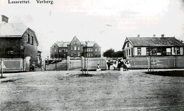 Vykort, " Lasarettet. Varberg". Länslasarettet invigdes 1901 i den södra delen av nuvarande kv Lasarettet. Den tidigare lasarettsbyggnaden från 1852 i kvarterets nordöstra del fortsatte att användas till köksavdelningen. Kvar stod också en byggnad, delvis av sten, med obduktionssal, bårhus, kurhus och sinnessjukhus. 1904 stod en ekonomibyggnad färdig, även inrymmande kontor, arkiv och personalbostäder. Då byggdes också en grindstuga i sten med bostad för portvakten och två rum för drängarna. Denna ses till vänster i bild och till höger i bild ses läkarvillan från 1883. De ligger utmed Prästgatan.