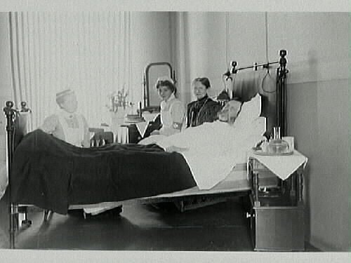 Sjukvård. Kyrkoherde Möller på lasarettet med ett par sjuksköterskor vid sängen.