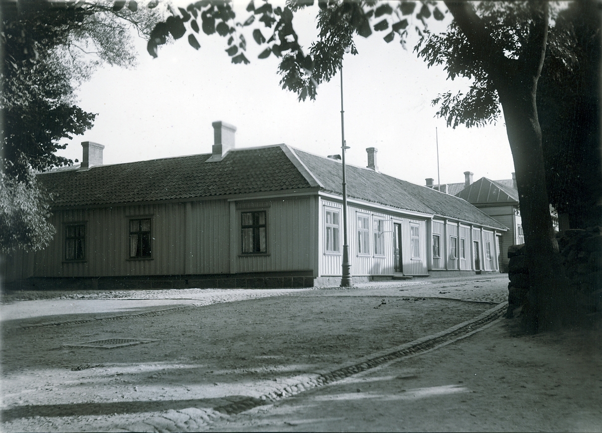 Ur byggmästare Johannes Nilssons fotoalbum från 1914. Timrad byggnad uppförd 1874 i hörnet Norra Vallgatan-Drottninggatan, kv Postmästaren.