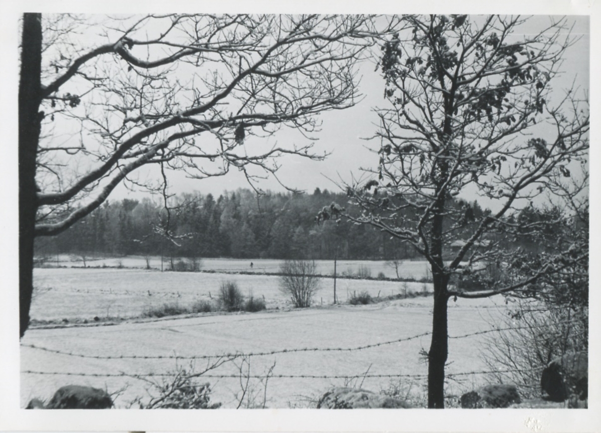 Vintertid över åkrarna i Hallen, okänt årtal. Till höger (bakom trädet) skymtas Hallen 1:2 "Fredriks" och i bakgrunden ses bergåsen mot Långåker. I området ligger idag Klintstensvägen och Klintmossevägen.