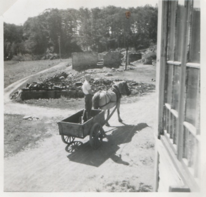 Efter branden i gamla ladugården, Labacka 1:2 "Lund" 1948. En okänd man med förspänd häst står på gårdsplanen utanför boningshuset som ses till höger.