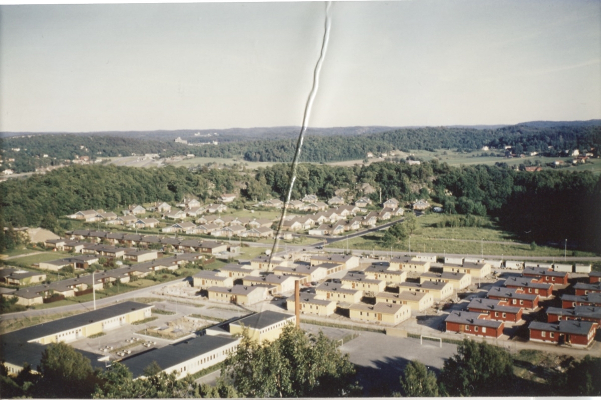 Flygfoto över Bölet/Hallen 1973. Närmast till vänster ses Hallenskolan. Villorna på Mor Annas väg är under uppbyggnad men alla hus är inte målade. På grönområdet till höger i bildens mitt byggdes senare Apelgårdens kyrka samt Knäckepilsvägens villor.