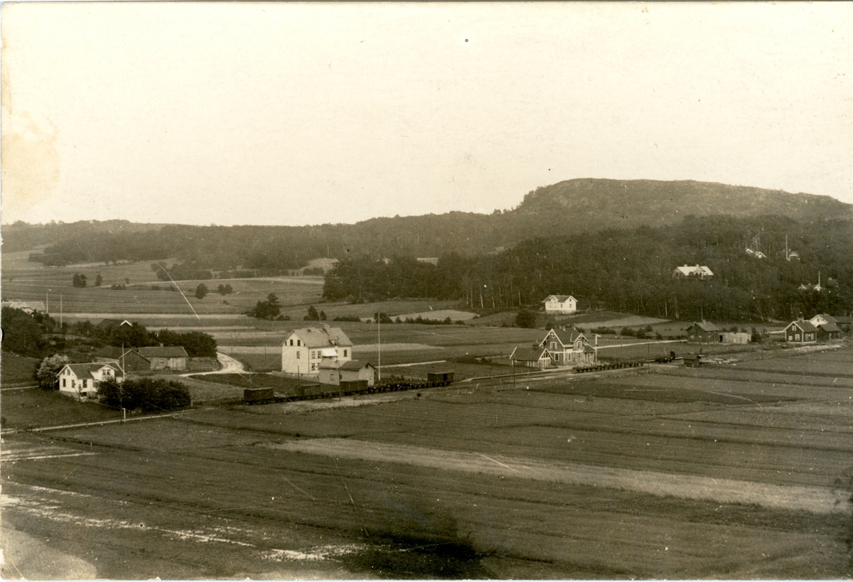 Kållered station cirka 1914. Från vänster: 1. Petterssons. 2. Gården Vommedal Västergård "Tyftet". 3. Landhandel. 4. Stationshuset, bakom vita villan "Knipan". 5. Pettershov (under byggnad). 6. Banvaktsstuga. 7. Annas "Hagen" Vommedal Östergård. I skogen ses Högbo.
