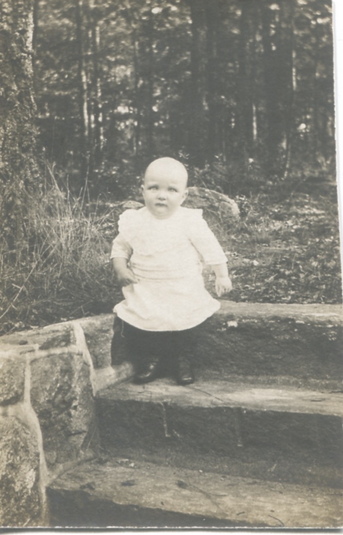 Valdemar "Lasse" Bengtsson (1912 - 1935) sitter utomhus på en stentrappa, Högbo cirka 1912-1913. Son till Ida (född Eriksson i Bölet, 1894 - 1965) och Johannes Bengtsson (1873 - 1942).