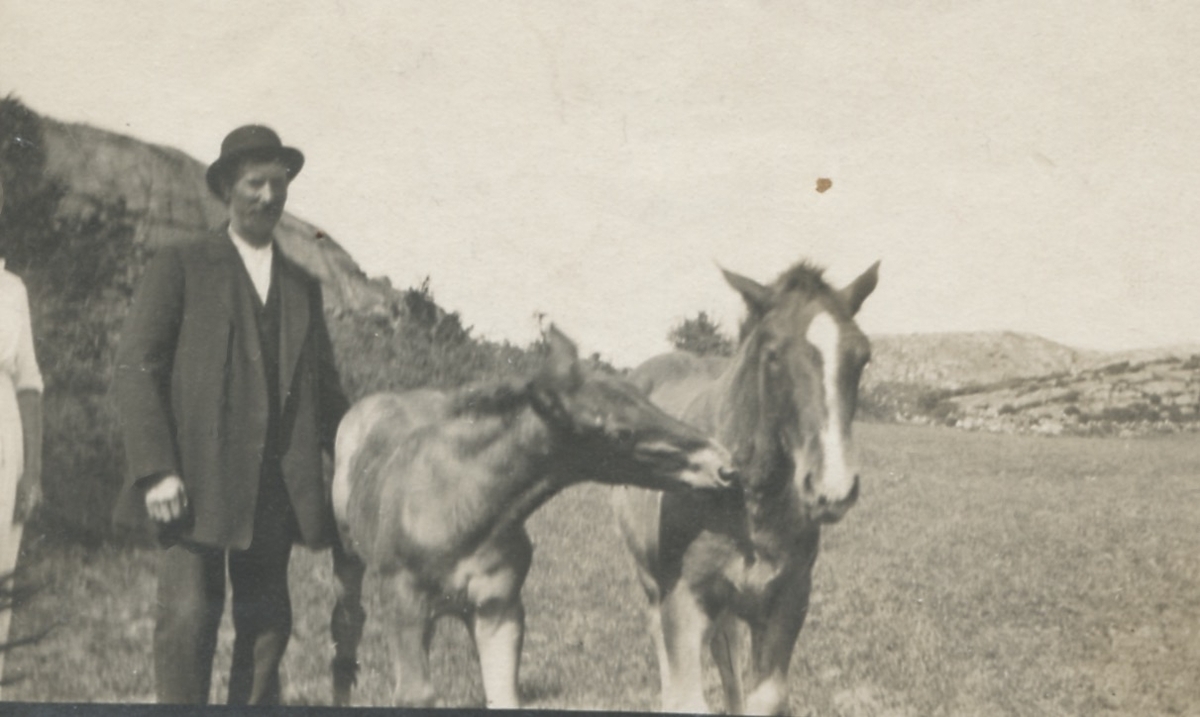 Natanael Bengtsson (1882 - 1968) står på åkern tillsammans med ett sto och föl, Långåker 1:3 "Natanaels" 1920-tal. Gården blev senare Kållereds hembygdsgård.