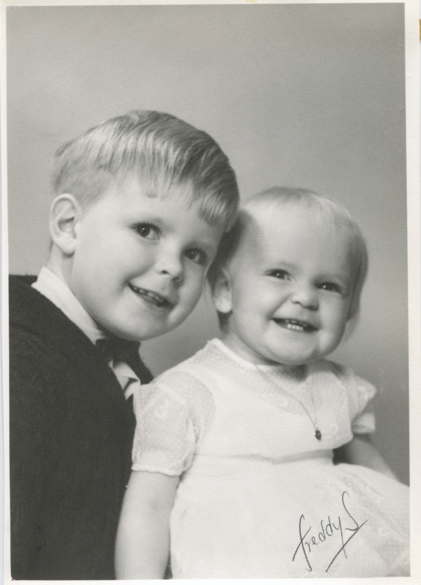 Ateljéporträtt av syskonen Ingemar (född 1956) och Maritha Johansson (född 1961), cirka 1962. Barn till Stina (1930 - 2019) och Bengt Johansson (1930 - 2016), Labacka Lund.
