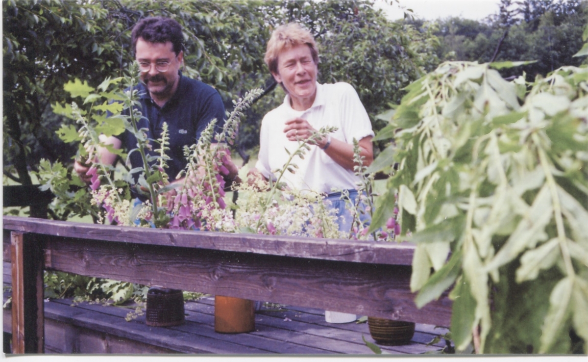 Midsommarfirande på Långåker 1:3 cirka 1990. Staffan Bjerrhede och Karin Gustafsson förbereder firandet.