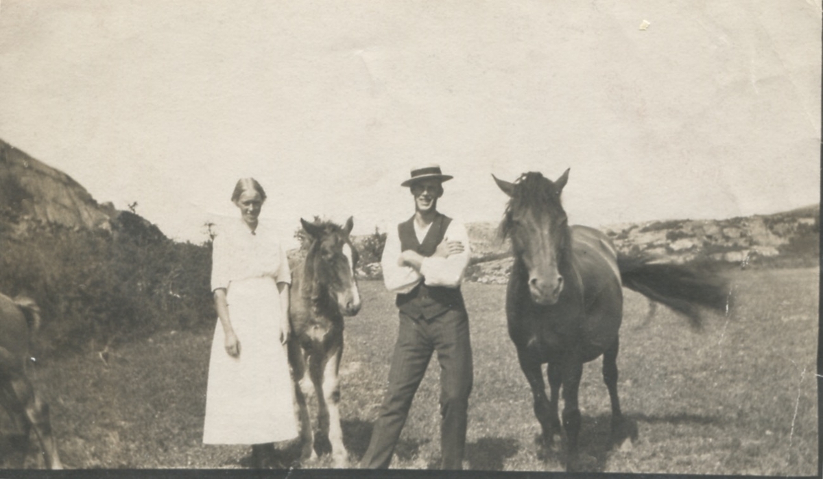 En kvinna* och Axel Johansson (född 1895 i Fotskäl - död 1974 i Labacka) står på en åker tillsammans med en arbetshäst och ett föl, Labacka Lund 1920-tal.