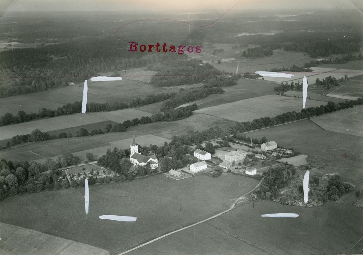 Flygfoto över Västra Eds kyrka. Original och bilden beskuren för vykort.