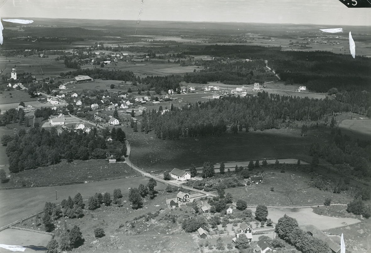 Flygfoto över Mörlunda kyrkby. Bilden visas obeskuren och beskuren till vykort.
