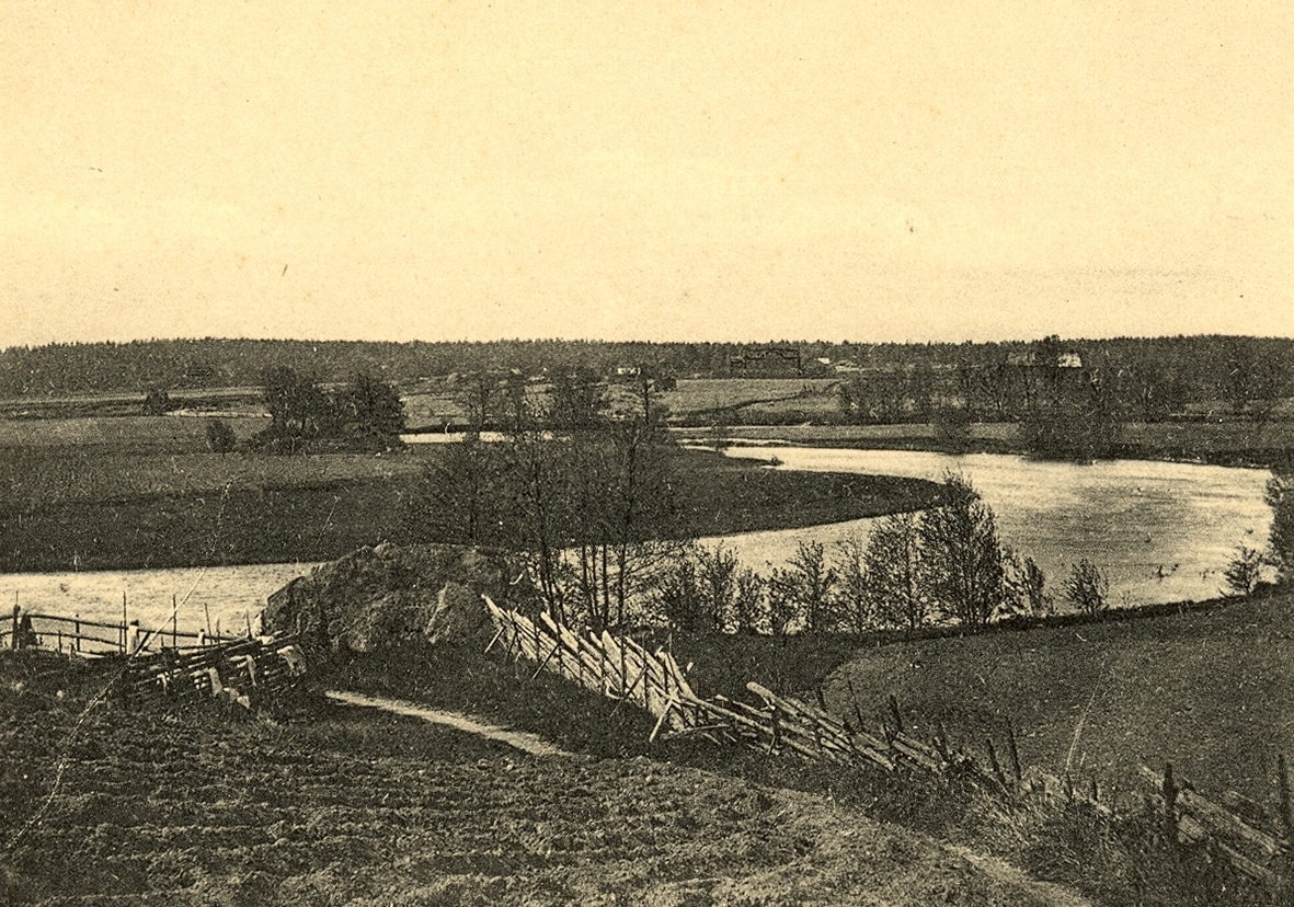 Vykort med motiv från Emån i Högsby. Här ser man hur ån meandrar genom åkerlandskapet. Det är lätt att